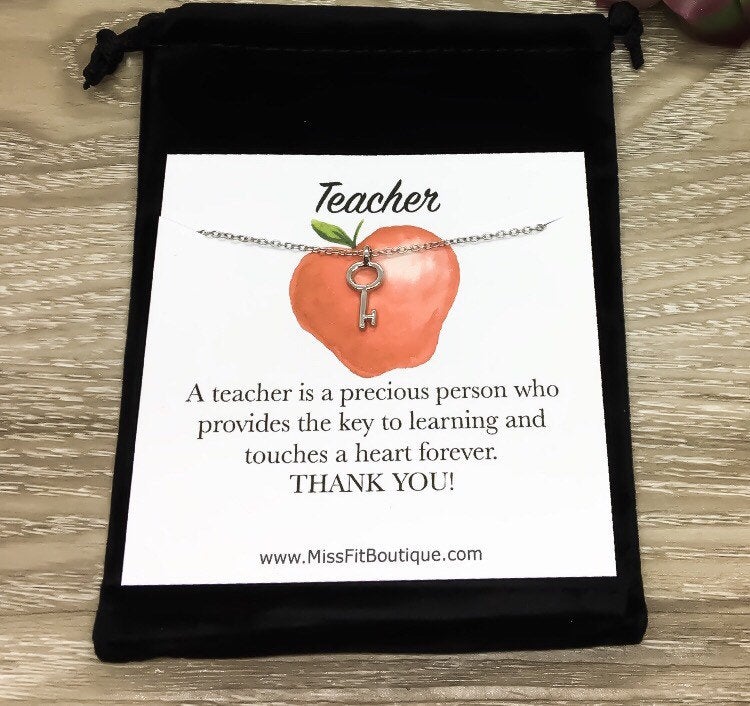 Carte de remerciement pour enseignant(e), collier avec petite clé, or, argent