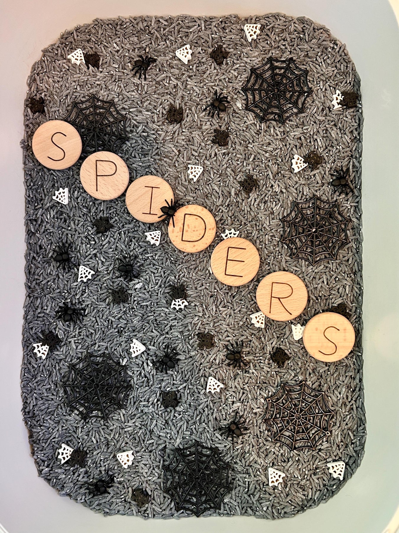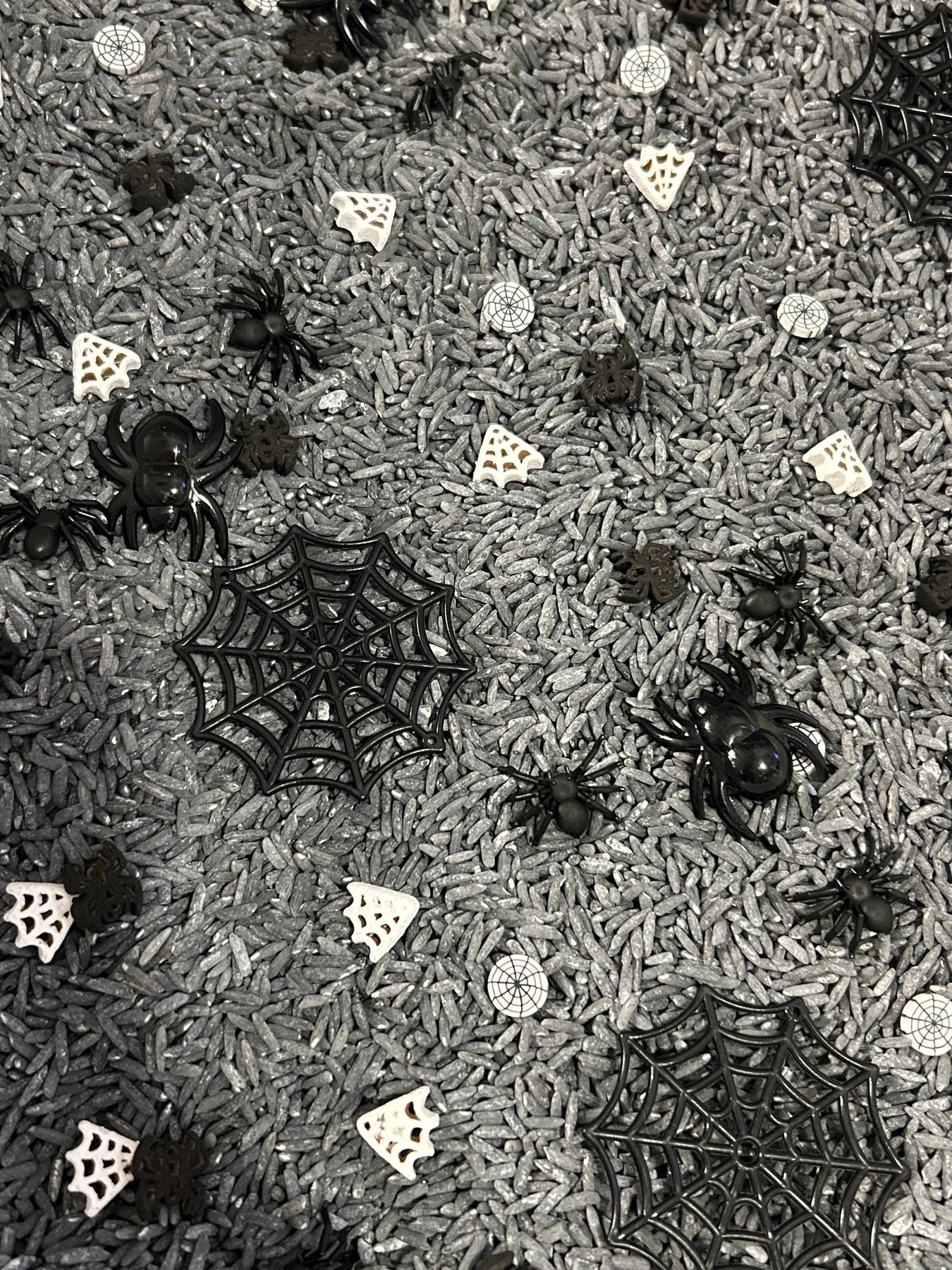 Spiderweb Sensory Filler Mix | Grey Rice Base with Handpainted Spiders & Webs | Sensory Bin | Loose Parts + Wooden Scoop | Playful Creations