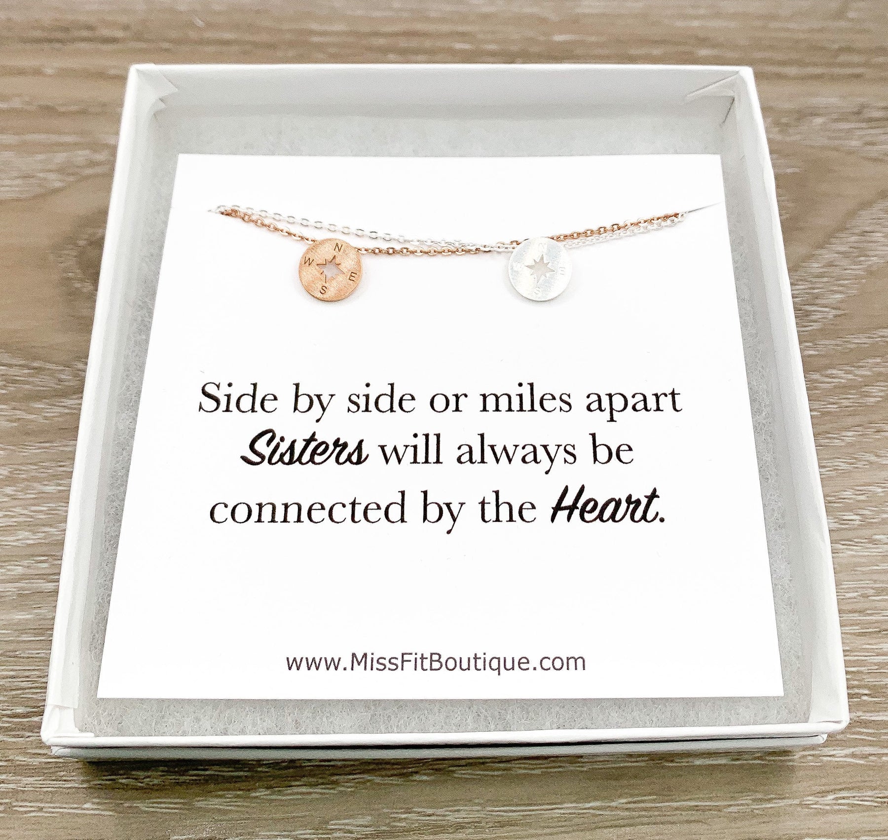 Ensemble de colliers Mini Boussole pour 2, Carte « Côte à côte ou à des kilomètres de distance », Cadeau d'une sœur, Bijoux de sororité, Cadeau pour sœurs, Bijoux de sororité, Petite sœur