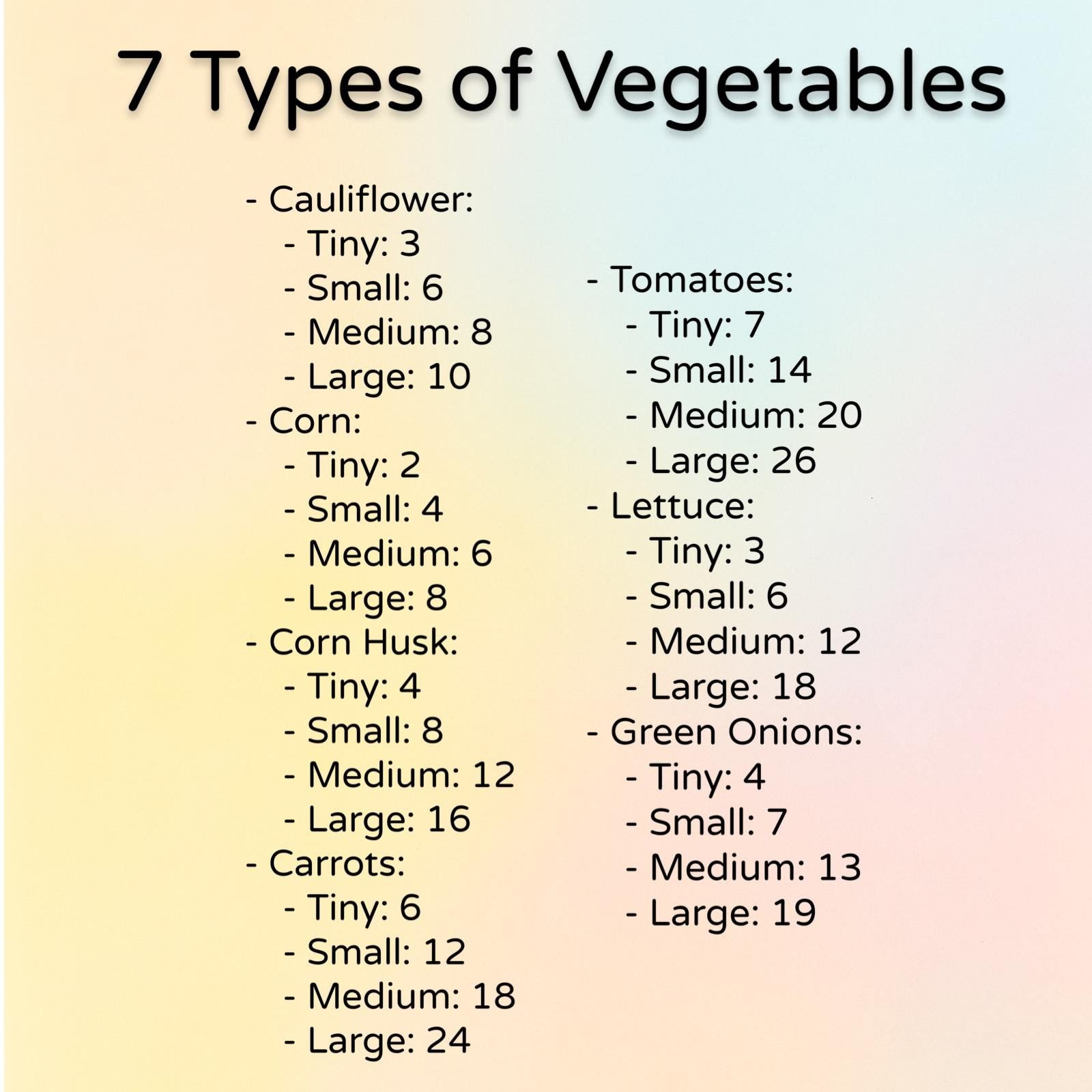 - Tiny (1 cup): 29 Veggies