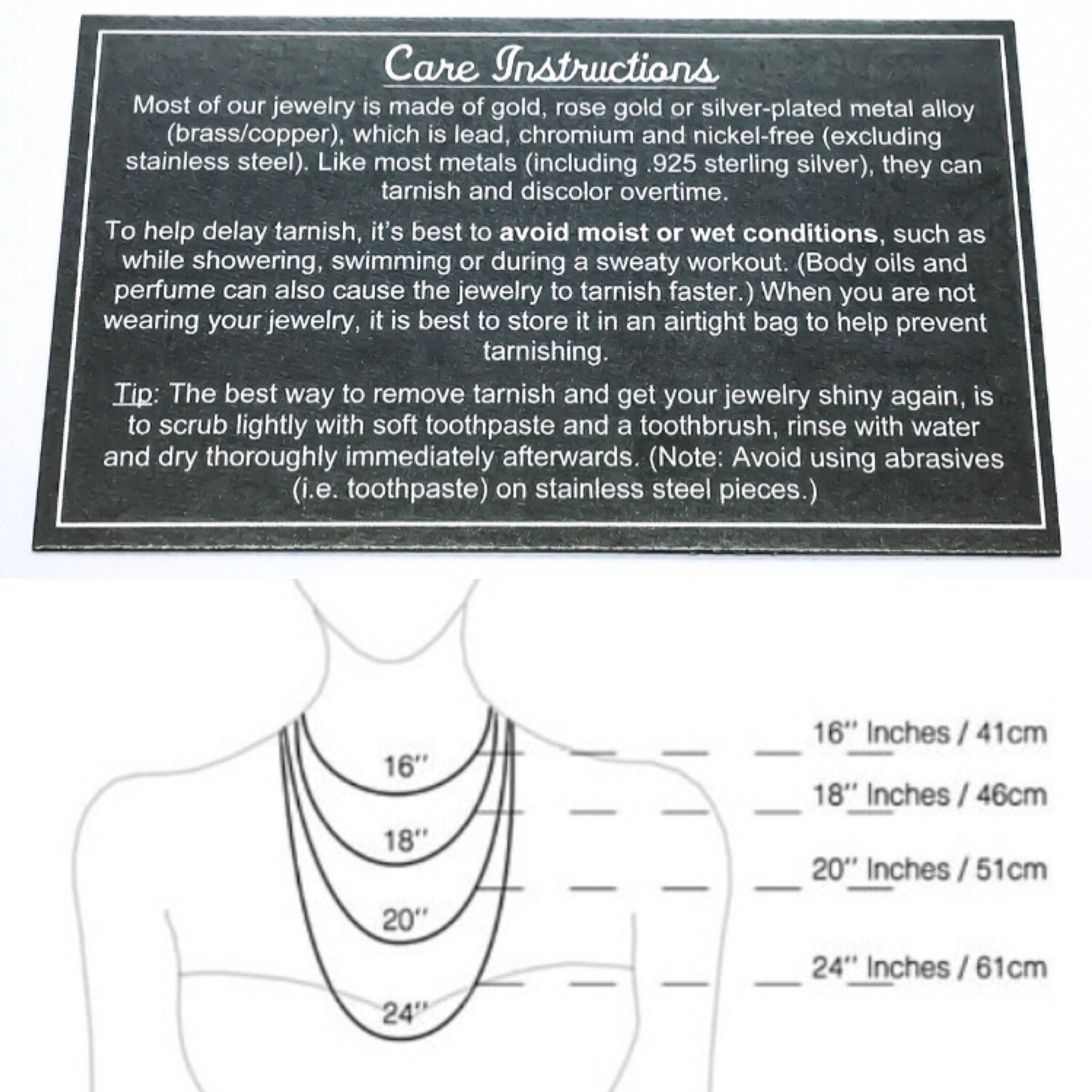 - 18” (45cm): average length / falls just below the throat at the collarbone;